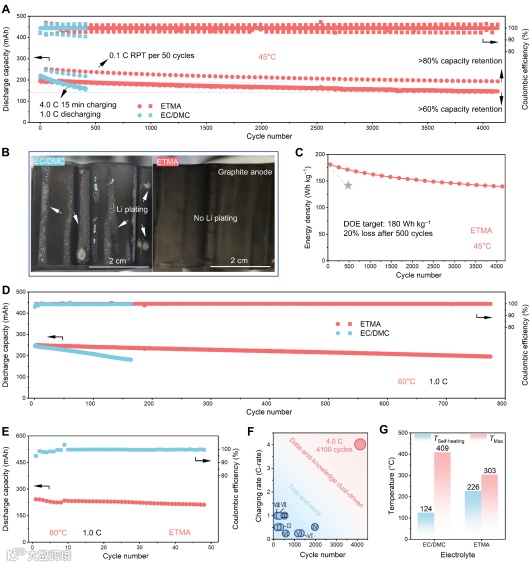图6. 软包电池的电化学性能和热安全性。(A) 石墨||NCM811软包电池在45℃和4.0℃下的循环性能(4.0 C下充电15分钟,然后在1.0 C下放电,每50次循环后进行一次0.1 C的容量标定)。(B) 在EC/DMC和ETMA基电解液中循环后的石墨负极极片图像。(C) 使用ETMA基电解液的锂离子电池能量密度。(D和E) 含有不同电解液的软包电池在60°C (D) 和85°C (E) 下的电化学性能。(F) 在已发表的文献和本工作中,商业化方壳/软包/圆柱形电池的性能比较,(工作温度和循环次数超过40°C和100次) (G) 不同电解液体系下软包电池热失控实验时的自加热温度和热失控最高温度。