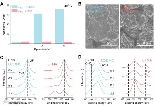 图5. 45℃下石墨负极界面化学和电极形貌的演变。(A) 45°C时,使用EC/DMC和ETMA基电解液的石墨||NCM811电池中RSEI的演变。(B)使用EC/DMC和ETMA基电解液的石墨||NCM811全电池在45°C下循环50次后的石墨电极扫描电镜图像。(C和D)EC/ DMC生成的SEI和ETMA电解液中衍生的SEI的XPS光谱,在45°C下循环50次后,石墨电极上的SEI的(C) F 1s和(D) O 1s谱图。