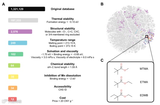 图3. 高温快充锂离子电池电解液分子设计。(A) 基于对分子和电解液的理化性质要求的筛选程序。(B) 每个筛选步骤中分子表征的可视化。(C) 三甲基乙酸甲酯(MTMA)、三甲基乙酸乙酯(ETMA)和2,2-二甲基丁酸乙酯(EDMB)三种推荐分子的结构式,用于进一步的实验验证。