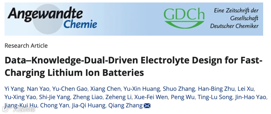 基于此,清华大学张强/陈翔团队与北京理工大学黄佳琦团队合作,在国际知名期刊《Angewandte Chemie》发表题为“Data–Knowledge-Dual-Driven Electrolyte Design for Fast-Charging Lithium Ion Batteries”的研究论文。该文章通过将数据与电解液设计知识融合的高通量筛选框架,以面向高温快充工况为导向,从130万个分子中优选出新型羧酸酯溶剂分子ETMA,其组成的电解液支持电池(能量密度为181 Wh kg−1)在45°C、4.0 C倍率下实现超4100次循环,且电池热失控时自加热温度较碳酸酯基电解液的锂电池提高了100°C。这项工作不仅变革了锂电池电解液设计和溶剂筛选的传统方法,而且证明了将领域知识嵌入到数据驱动和机器学习方法中的显著优势。