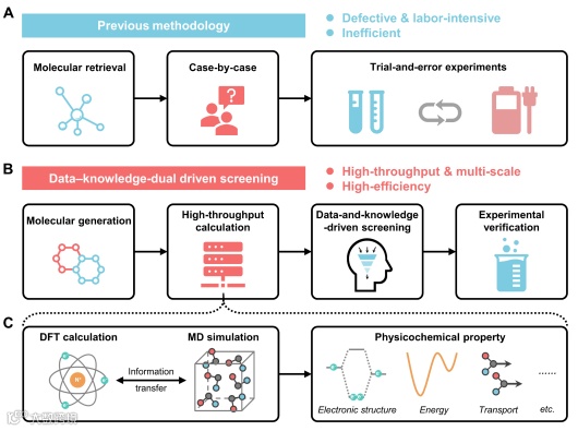 图1. 实验试错法和数据-知识双重驱动的分子挖掘框架。(A) 以前的分子筛选方法包括三个步骤:有限范围内的分子检索,个例分析,重复和低效的试错实验。(B和C) 数据-知识双驱动的分子设计包括四个步骤:分子生成、高通量计算、数据-知识驱动的筛选和实验验证。