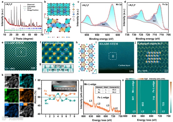 图2. (a) LM5F5P的XRD谱图; (b) 沿[100]和[010]观察的LM5F5P晶体结构示意图; (c-d) Fe 2p和Mn 2p的高分辨率XPS; (e) HAADF-STEM图像; (f) 区域i的放大图, (g) f中的线形图; (h) 沿[001]观察LM5F5P晶体结构示意图; (i) HAADF-STEM图像; (j) i的放大图。(k) LM5F5P的HAADF-STEM图和EDS图谱; (l) 梯度线上Fe、Mn原子浓度; (m) Mn L-edge, Fe L-edge的EELS, l区域对应的元素含量; (n) l沿梯度线生成的EELS谱等值线图。