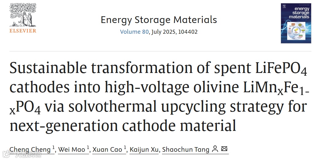 Cheng Cheng, Wei Mao, Xuan Cao, Kaijun Xu, Shaochun Tang*. Sustainable Transformation of Spent LiFePO4 Cathodes into High-Voltage Olivine LiMnxFe1-xPO4 via Solvothermal Upcycling Strategy for Next-Generation Cathode Material. Energy Storage Materials, 2025, 80, 104402. DOI: 10.1016/j.ensm.2025.104402.