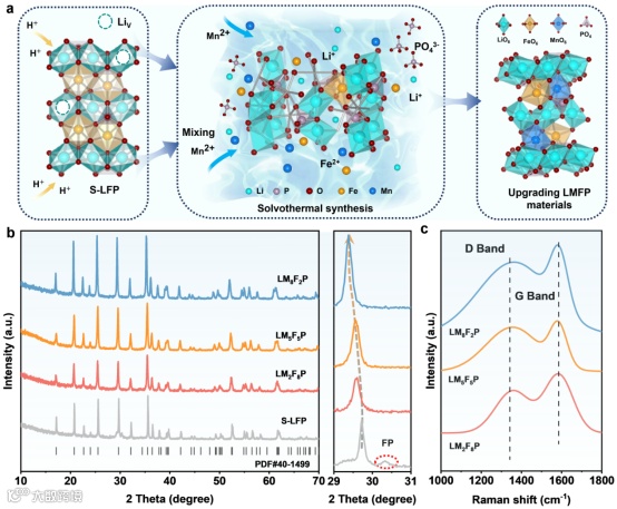 图 1. (a) 溶剂热将S-LFP升级为LMFP循环策略示意图;(b) LMFP和S-LFP的XRD图谱;(c) 再生升级后LMFP材料的拉曼光谱图。