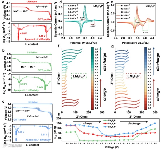 如图4a-c所示,通过GITT计算LMFP在放电过程中的锂离子扩散系数(DLi)。随着锰含量增加,LiMnPO4在固溶体中占主导地位,降低了LMFP的离子电导率,当锰含量为0.8时DLi急剧下降(图4c)。图4d、4e、S7、S8为不同扫速下LMFP和S-LFP的循环伏安曲线。Fe在LM2F8P和LM5F5P中的极化电压低于S-LFP,而Fe在LM8F2P中的极化电压甚至高于S-LFP。随着Mn含量的增加,LMFP中Mn的极化电压不断增大。LMFP在第一次循环时的内阻变化(图4f-h、S9)表明,Rct在充放电过程中呈现先减小后增大的趋势,这与充放电过程中电子电导率和离子电导率的变化有关。Rct随Mn含量的增加呈增加趋势,表明LMFP的电子电导率和离子电导率随掺杂量的增加而降低,与循环伏安法和GITT法观察到的规律一致。