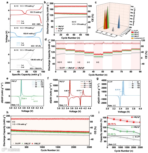 团队对LM5F5P的微观结构进行了详细分析。XRD Rietveld细化表明LM5F5P具有有序的Pnmb空间群(图2a)。XPS光谱证实了Fe和Mn在LM5F5P中均呈现+2价态(图2c, d)。高角环形暗场扫描透射电子显微镜(HAADF-STEM)结果表明,颗粒表面有一层均匀的碳包覆层,厚度约2-3 nm(图i),该碳层有助于提高电极材料的电子导电性,有利于电化学循环过程中的电荷转移。LM5F5P中Fe和Mn原子的规则排列(图2e)。进一步放大图(2f)与LM5F5P在[002]方向的晶体结构示意图(图2g)表明,溶剂热再生得到的LM5F5P已构建了完整的锂离子输运通道。