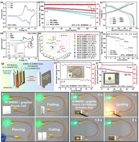图 5 (a)NCM9055 | PPLC GPEs | Li 电池在 0.1 mV s-1 下的 CV 曲线;(b)不同多相聚合物电解质组装的 NCM9055 | Li 电池在 25°C、0.3 C 倍率下的循环性能;NCM9055 | PPLC GPEs | Li 电池在 0.3 C 下的(c)充放电曲线及(d)dQ/dV 曲线;(e)NCM9055 | PPLC GPEs | Li 电池与近期文献报道的基于 PEO 电解质体系的 Ni-rich NCM SSLMBs 的容量及循环性能对比;(f)不同多相聚合物电解质组装的 NCM9055 | Li 电池在 25°C 下的倍率性能;(g)软包电池组装示意图;(h)NCM9055 | PPLC GPEs | Li 软包电池及(i) NCM9055 | PPLC GPEs | graphite 软包电池在 25°C、0.3 C 倍率下的循环性能;(j)NCM9055 | PPLC GPEs| graphite 软包电池的滥用测试与(k)燃烧测试。