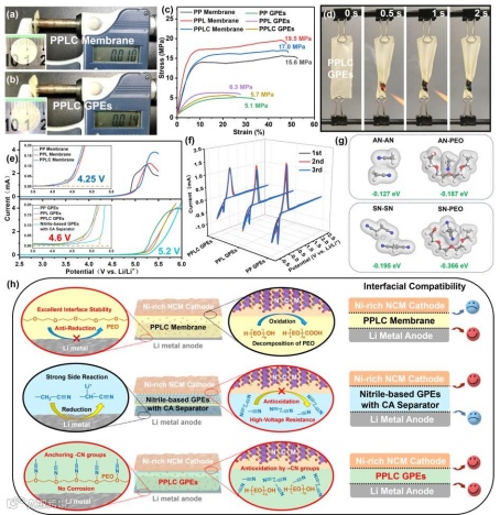 图 4 (a)PPLC 膜与(b)PPLC GPEs 的光学照片;(c)不同 PEO 基 CPEs 与多相聚合物电解质的应力-应变曲线;(d)PPLC GPEs 的燃烧测试;(e)不同 PEO 基 CPEs、腈基 GPEs 及多相聚合物电解质的 LSV 曲线;(f)不同多相聚合物电解质的 CV 曲线;(g)AN-AN、SN-SN、AN-PEO 及 SN-PEO 体系的结合能;(h)通过 PPLC 膜与腈基 GPEs 的整合实现 PPLC GPEs 与高镍三元正极/锂金属负极界面相容性双向增强的示意图。