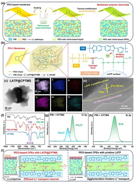 图 2 (a)多相聚合物电解质的制备过程示意图;(b)LATP@CPTMS 纳米填料与聚合物链的化学相互作用;(c-e)LATP@CPTMS 颗粒的 HRTEM 图像及 EDS Mapping 分布图;(f)样品膜与 CPTMS 的 FT-IR 图谱; PBI+CPTMS 膜的 XPS(g)Cl 2p 谱图及(h)Si 2p 谱图;(i)LATP 填料表面修饰前后对 Li⁺传导影响的示意图。