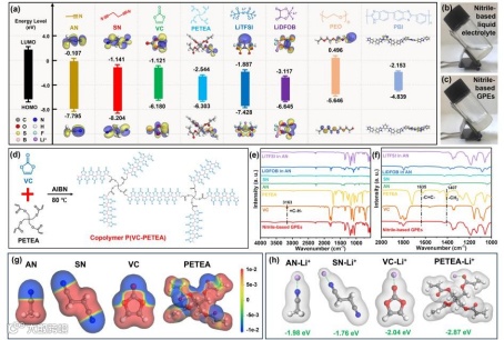图 3 (a)电解质各组分的 HOMO 与 LUMO 能级计算结果;(b)腈基电解液与(c)腈基 GPEs 的光学照片;(d)VC 单体与 PETEA 交联剂共聚反应机理;(e)腈基 GPEs 及其组分的全谱段 FT-IR 图谱及(f)局部放大谱图;(g)AN、SN、VC 和 PETEA 分子的静电势分布;(h)AN-Li⁺、SN-Li⁺、VC-Li⁺及 PETEA-Li⁺的配位结构及其对应结合能。