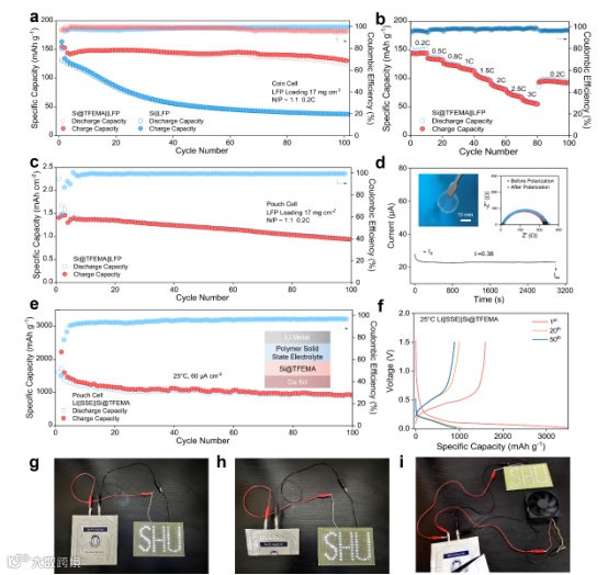 采用纯聚合物的固态电解质体系可与Si@TFEMA搭配使用。在25°C下对扣式电池进行测试,以Si@TFEMA为负极的纯聚合物固态电解质半电池能够实现50次循环,在循环50次后仍能仍保持1000 mAh g⁻¹的比容量;采用固态电解质的软包电池在100次循环后仍能仍保持1000 mAh g⁻¹的比容量。软包电池在不同循环次数下的充放电曲线表明,在活化后,循环过程中几乎没有明显的容量衰减,为安全性大容量电池体系通过可行思路。