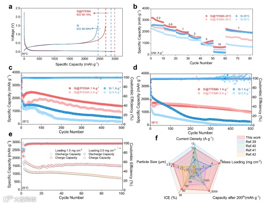 图2 硅(Si)和Si@TFEMA电极的电化学性能(a)25℃下的首次充/放电曲线和初始库仑效率;(b)25℃和50℃下Si和Si@TFEMA电极的倍率性能;(c,d)在不同电流密度下,质量负载为0.5–0.7 mg cm-2时,25℃和50℃下Si和Si@TFEMA电极的循环性能;(e)质量负载为1.5–3.0 mg cm-²时,Si@TFEMA电极的循环性能;(f)Si@TFEMA与其他光伏硅废料改性材料的性能对比
