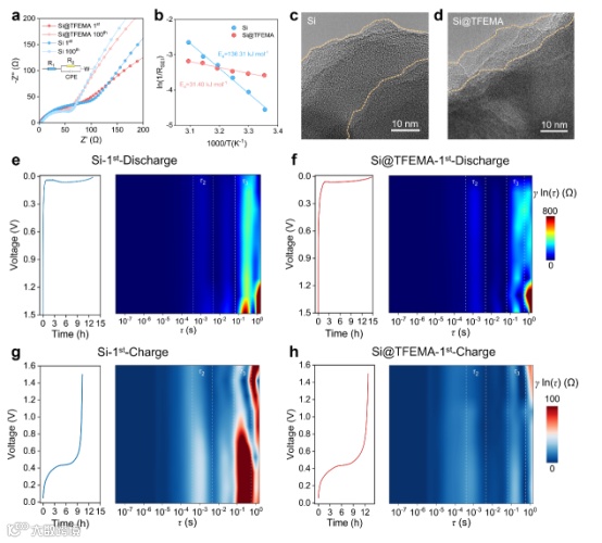 图3 界面传输机制(a)Si和Si@TFEMA电极在第1次和第100次循环时的电化学阻抗谱(EIS);(b)Si和Si@TFEMA电极的固体电解质界面膜(SEI)电阻(RSEI)的阿伦尼乌斯(Arrhenius)图;(c,d)经过100次循环后的Si和Si@TFEMA电极的高分辨透射电子显微镜(HRTEM)图像。(e,f,g,h)Si和Si@TFEMA电极的首次充/放电曲线及其对应的弛豫时间分布(DRT)
