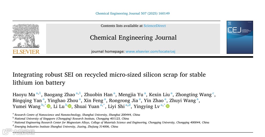 近日,上海大学的吕盈盈副教授、袁帅教授与新加坡国立大学(重庆)研究院王玉美研究员在国际知名期刊Chemical Engineering Journal上发表题为“Integrating robust SEI on recycled micro-sized silicon scrap for stable lithium ion battery”的研究论文。该论文通过有机包覆光伏硅渣的方式,诱导生成富含LiF 的固体电解质界面(SEI),实现了光伏硅渣在不同场景下(高温、全电池、固态电解质匹配)作为锂离子电池负极材料的可循环利用。
