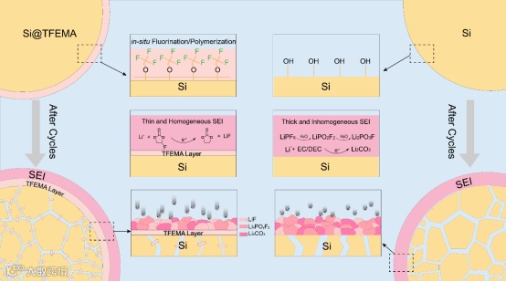 具有强吸电子性的三氟甲基封端弹性层包覆光伏硅渣诱导稳定的电极界面构建,在循环过程中,极性包覆层诱导Si@TFEMA电极表面以富LiF的SEI逐渐生长,同时促进Li+在电解质与电极界面的扩散,降低电极的电荷转移阻抗;同时原位包覆层具有应力耗散功能,有效抑制硅颗粒本征的膨胀破碎,保持电极完整性。