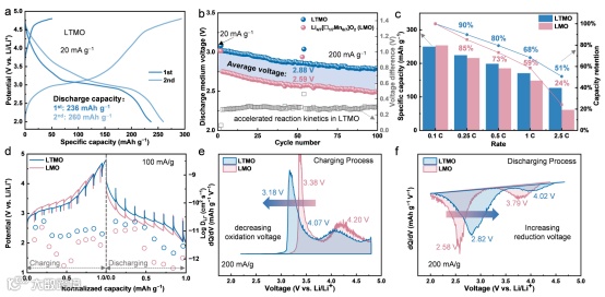 Figure 2. Electrochemical properties of the optimized LTMO cathode. a) The initial two charge/discharge curves of LTMO cathode at 0.1 C with a voltage range of 2–4.8 V. b) Discharge medium voltage retention of LTMO and LMO cathodes during 100 cycles at 1 C. c) Rate performance of LTMO and LMO cathodes from 0.1 C to 2.5 C and corresponding capacity ratio of the initial capacity at 0.1 C. d) GITT profiles and Li+ diffusion coefficients of LTMO and LMO cathodes upon the second cycle at 100 mA g-1. dQ/dV curves of LMO and LTMO cathodes during e) charging process and f) discharging process at 200 mA g-1.