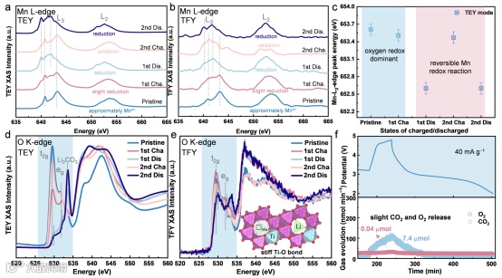 Figure 4. Relatively reversible Mn and oxygen redox reactions in the optimized LTMO cathode. Ex situ Mn L-edge sXAS spectra of LTMO cathode in the a) TEY mode and b) TFY mode at different charged/discharged states. c) Variations in peak energies of Mn L2-edge (TEY mode). Ex situ O K-edge sXAS spectra of LTMO cathode in the d) TEY mode and e) TFY mode at different charged/discharged states. The diagram of ordered Ti/Mn/□ arrangement is in the insert. f) Gas evolution profiles of O2 and CO2 in LTMO cathode during the initial cycle.