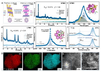 图1展示了Ti修饰Li-O-vacancy构型正极的结构及形貌表征信息。具体来说:(a)展示了离子交换合成Li-O-vacancy构型正极示意图,(b)为Ti取代的钠电前驱体的XRD图谱及精修结果,(c)为钠电前驱体的核磁谱图,(d)和(e)分别为Ti修饰后Li-O-vacancy构型正极的XRD精修图谱和核磁谱图,(f)为Li-O-vacancy构型正极刻蚀前后的Ti 2p谱图,(g-i)为Li-O-vacancy构型正极的元素mapping图及HRTEM图。