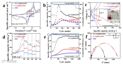 搭载 S-C₃N₄QDs@ZSO 电解质的 Zn||Cu 不对称电池,库仑效率达 99.09%,稳定循环超 300 次;Zn||V₂O₅全电池在 5 A/g 电流密度下,比容量约 74 mAh/g,2000 次循环后容量保持率 100%,性能显著优于未添加 S-C₃N₄ QDs 的电池。