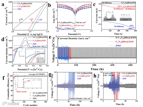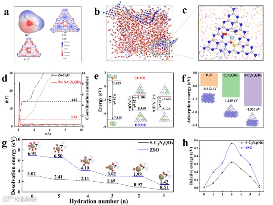 分子动力学(MD)模拟与密度泛函理论(DFT)计算显示,S-C₃N₄ QDs 通过静电吸引增强与 Zn²⁺作用,减少 Zn²⁺配位水分子数,使去溶剂化能垒从 6.91 eV 降至 3.02 eV,Zn²⁺ 扩散能垒降至 0.31 eV,加速离子迁移,抑制枝晶生长。