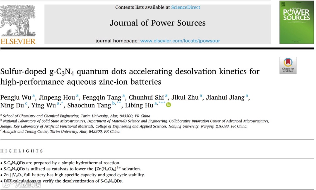 近日,来自塔里木大学的吴瑛教授、胡立兵副教授与南京大学的唐少春教授合作,在国际知名期刊Journal of Power Sources上发表题为“Sulfur-doped g-C3N4 quantum dots accelerating desolvation kinetics for high-performance aqueous zinc-ion batteries”的观点文章。该观点文章分析了S原子对C3N4量子点的电子结构的调控,同时利用其催化[Zn(H2O)6]2+去溶剂化,加速了其去溶剂化动力学,从而,在此过程钟释放出更多的游离Zn2+,有利于Zn2+离子在充放电过程中的可逆性,有效抑制了副反应的发生,极大地提升了水系锌离子电池性能。