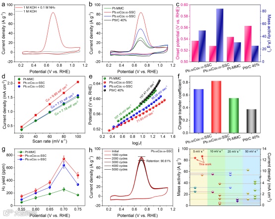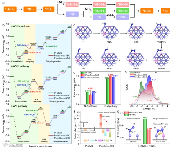 本研究提出并验证了一种更具现实性的亲核攻击AOR反应机制。通过理论计算证实,Pt上经由亲核攻击机制的AOR过程比传统G-M机制更具热力学优势,同时游离氨分子越早对单氮中间体发起亲核攻击实现N-N偶联,整体反应的能垒就越低。此外,通过微量钴置换形成固溶体可进一步触发中间体的桥式吸附模式,从而削弱N-H键以促进后续脱氢。据此制备了微量钴置换铂固溶体催化剂(PtxCoy-SSC),并通过独特设计的三段式同位素标记实验直接捕捉标志性中间体,为亲核攻击机制的存在提供了强力佐证。原位表征实验以及电化学性能与理论结果的一致性进一步证实了该催化剂对AOR动力学的促进作用。在机制导向设计的推动下,优化钴含量的催化剂展现出优异的AOR活性,在5 mV s–1扫速下实现高达83.96 A g–1的峰值电流密度。将其组装为DAFC后,在低至60°C的温度下输出了高达853.75 mW cm–2的卓越功率密度,并能连续稳定运行300小时。这一策略为优化高效阳极AOR催化剂提供了新的视角,助力低温DAFC向更经济实用的水平推进。