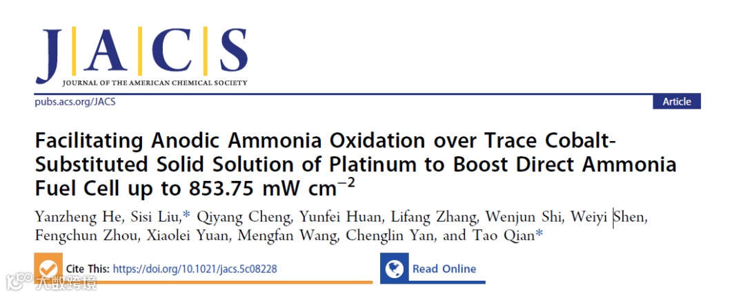 近日,来自南通大学的钱涛教授与刘思鸶教授团队在国际知名期刊Journal of the American Chemical Society上发表题为“Facilitating Anodic Ammonia Oxidation over Trace Cobalt-Substituted Solid Solution of Platinum to Boost Direct Ammonia Fuel Cell up to 853.75 mW cm–2”的研究成果。本研究受均相催化氨氧化过程的启发,理论预测并通过三段式同位素标记实验验证了一种通过游离氨分子攻击预吸附*NHx中间体进行反应的亲核攻击反应机制,该机制可放宽异相催化空间及电荷约束。在这种更实际机制的指导下,通过构建微量钴置换铂固溶体催化剂实现了高效的AOR过程,在5 mV s–1扫描速率下获得了高达83.96 A g–1的卓越峰值电流密度。以其组装的DAFC在60 °C下峰值功率密度高达853.75 mW cm–2,且在连续运行300小时后仍具备95.14%的性能保持率。这一工作为推动低温DAFC向实用化迈进提供了参考。