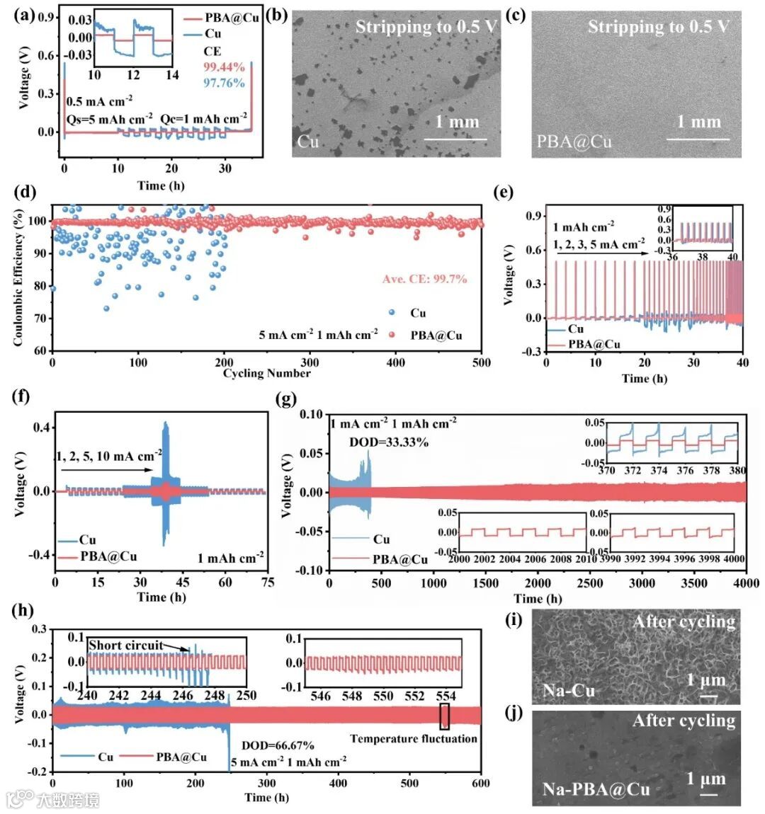 图4. 钠的沉积/剥离可逆性研究。(a) Na||PBA@Cu与Na||Cu电池在0.5 mA cm⁻²下的库仑效率(CE)曲线;(b, c) 剥离至0.5 V后的Cu与PBA@Cu表面的扫描电子显微镜(SEM)图像;(d) Na||PBA@Cu与Na||Cu不对称电池在5 mA cm⁻²、1 mAh cm⁻²条件下的恒流充放电循环曲线;(e) Na||PBA@Cu与Na||Cu不对称电池的倍率性能;(f) Na-PBA@Cu||Na-PBA@Cu与Na-Cu||Na-Cu对称电池的倍率性能;Na-PBA@Cu||Na-PBA@Cu与Na-Cu||Na-Cu对称电池在(g) 1 mA cm⁻²、1 mAh cm⁻²和(h) 5 mA cm⁻²、1 mAh cm⁻²条件下的恒流充放电循环曲线;循环后Na-Cu (i) 和Na-PBA@Cu (j) 的扫描电子显微镜(SEM)图像。