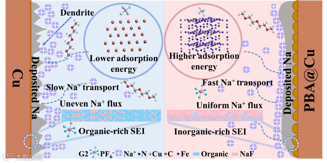 PBA@Cu表面形成的SEI层结构及其对钠离子传输和沉积行为的影响。PBA@Cu表面的SEI以高导电性的无机NaF为主,分布在表层,有助于快速钠离子传输和均匀沉积;内层则富含有机组分,具有良好的柔韧性,能适应电极体积变化,保持SEI完整性。相比之下,裸Cu的SEI主要由有机成分组成,导电性较差。理论计算显示PBA@Cu对PF₆⁻阴离子的吸附能远高于裸Cu,特别是PBA中的C≡N官能团对PF₆⁻有强吸附能力,促进钠盐的解离释放更多钠离子,提升钠离子导电性和迁移速率。综合来看,PBA@Cu通过强阴离子结合促进NaF梯度SEI形成,提供高导电性无机相稳定界面,降低界面阻抗,加快钠离子迁移;同时PBA本身对钠有高结合能和低扩散势垒,均匀分布钠离子浓度和电场,促进均匀沉积和剥离,减少枝晶和死钠,提高库仑效率,显著提升电池性能。