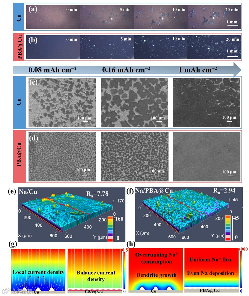 图3. 钠沉积形貌与成核机制研究。(a, b) 在1 mA cm⁻²电流密度下,钠在Cu和PBA@Cu表面沉积过程的原位光学显微镜表面观察图;(c, d) 不同钠沉积容量下Cu和PBA@Cu表面的扫描电子显微镜(SEM)图像;(e, f) 钠沉积容量为1 mAh cm⁻²时,Cu和PBA@Cu表面的激光共聚焦扫描显微镜(LCSM)图像;(g, h) COMSOL模拟结果,分别显示钠沉积过程中Cu和PBA@Cu的电流密度分布与Na⁺浓度分布。