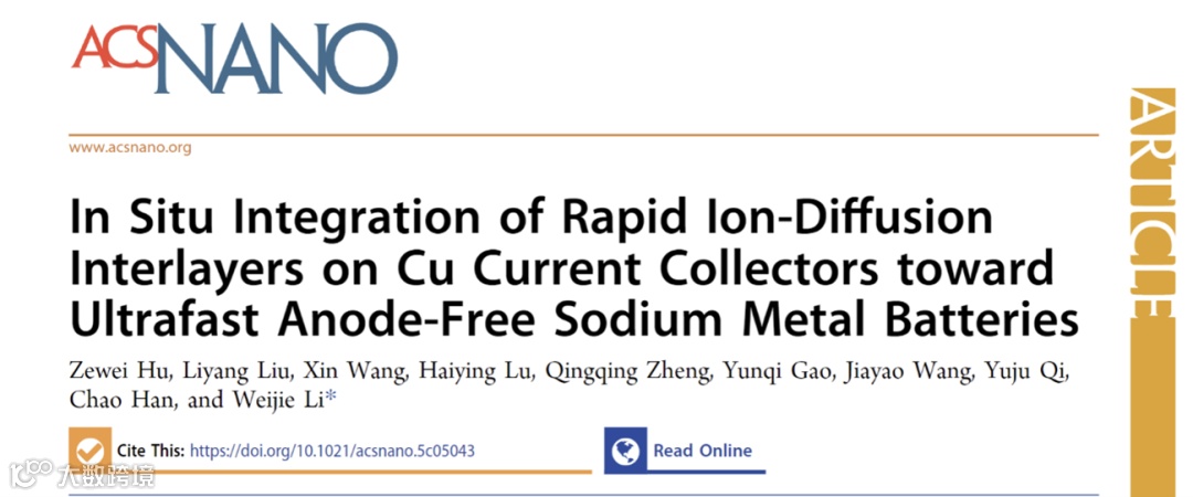 其成果以题为 "In Situ Integration of Rapid Ion-Diffusion Interlayers on Cu Current Collectors toward Ultrafast Anode-Free Sodium Metal Batteries" 在国际知名期刊 ACS NANO上发表。本文第一作者为博士生胡泽伟,通讯作者为李维杰教授,通讯单位为中南大学粉末冶金研究院。