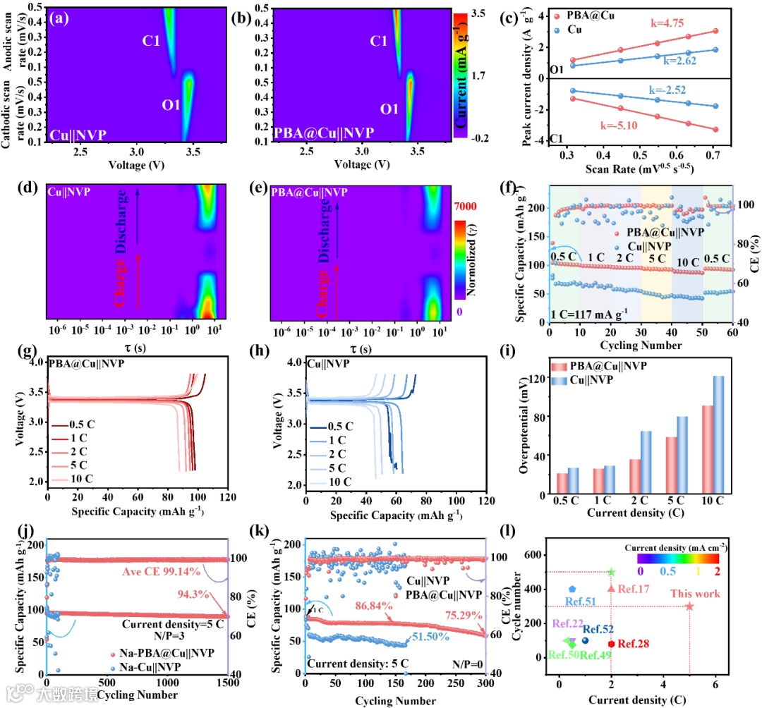 图6. 无负极钠金属电池的电化学性能。(a, b) 不同扫描速率下PBA@Cu||NVP与Cu||NVP电池的CV等高线图;(c) Cu和PBA@Cu在不同扫描速率下C1与O1峰电流与扫描速率平方根的拟合关系图;原位EIS测试的Nyquist曲线DRT分析结果,分别对应(d) Cu||NVP 与(e) PBA@Cu||NVP 无负极电池;(f) PBA@Cu||NVP 与 Cu||NVP 无负极电池的倍率性能;(g, h) 不同电流密度下(g) PBA@Cu||NVP与(h) Cu||NVP电池的电压曲线;(i) Cu||NVP 与 PBA@Cu||NVP 电池在不同电流密度下的过电位比较;(j) Na-Cu||NVP与Na-PBA@Cu||NVP无负极电池在5 C条件下的长循环性能(N/P=3);(k) Cu||NVP 与 PBA@Cu||NVP 无负极电池在5 C条件下的长循环性能;(l) 本工作中PBA@Cu||NVP无负极电池的循环性能与已有文献中基于NVP的无负极电池在电流密度和循环寿命方面的对比图。