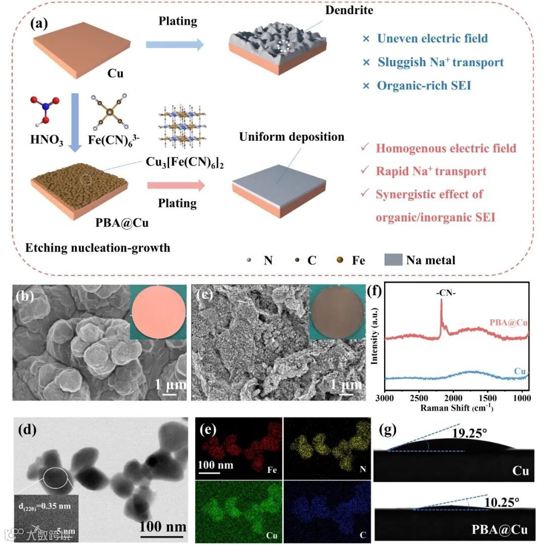 通过“刻蚀-成核-生长”法在室温下原位构建PBA涂层的方法。在HNO₃溶液中,Cu箔表面析出Cu²⁺并与[Fe(CN)₆]³⁻反应生成铜铁氰化物(PBA)纳米层,。该方法简单、低成本、适用于大面积制备,并通过多种表征手段(SEM、TEM、XRD、Raman、XPS)证实了PBA的成功合成。此外,PBA层显著提升了电极界面润湿性和Na⁺扩散性能,为后续钠沉积提供均匀、快速的离子传输路径。