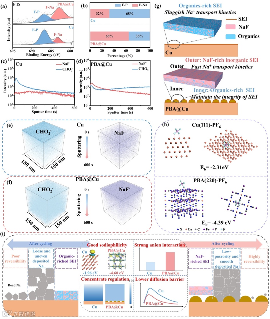 图5. SEI结构的演化过程。(a) 活化后的PBA@Cu与Cu基底的F 1s XPS谱图;(b) PBA@Cu与Cu基底上氟化物组分的相对含量;(c, d) Cu与PBA@Cu表面的ToF-SIMS深度剖面图,分别对应(c) CHO₂⁻和(d) NaF⁻;(e, f) Cu和PBA@Cu表面不同离子的空间分布图;(g) Cu与PBA@Cu表面的SEI组分示意图;(h) PF₆⁻在Cu和PBA@Cu上的吸附位点与结合能;(i) Cu与PBA@Cu基底在电化学过程中的对比示意图。