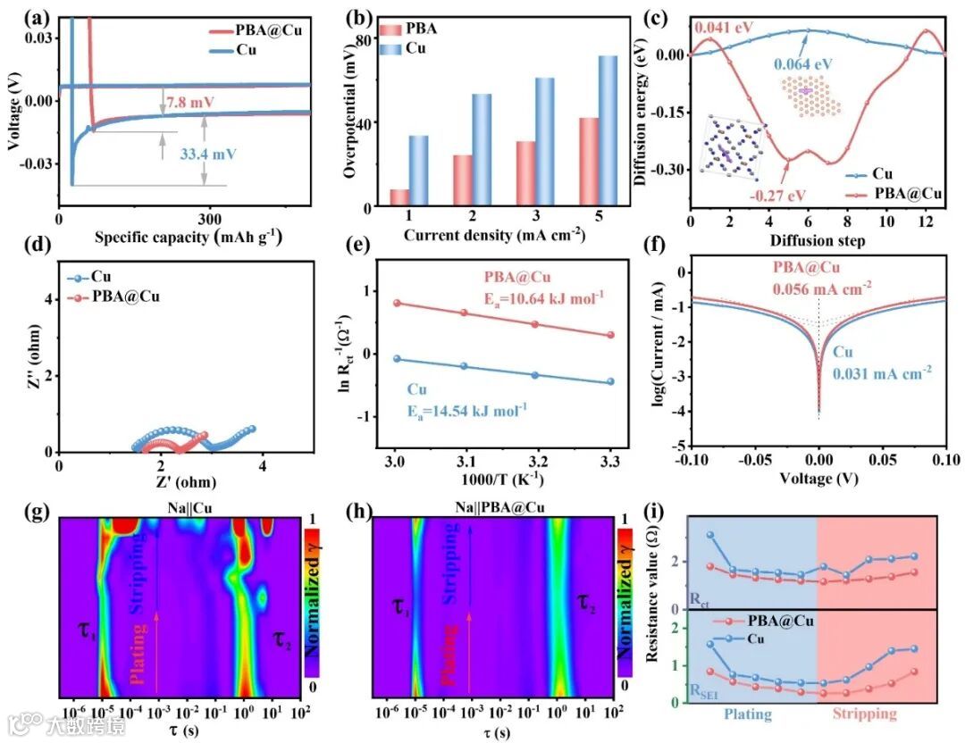 图 2. PBA@Cu加速钠离子的扩散和反应动力学。(a) Cu和PBA@Cu在1 mAh cm⁻²条件下的成核过电位;(b) 不对称电池在不同电流密度下的成核过电位;(c) Na⁺在Cu和PBA@Cu表面的扩散能垒及对应的扩散路径;(d) Na-Cu||Na-Cu与Na-PBA@Cu||Na-PBA@Cu对称电池在30 ℃下的电化学阻抗谱(EIS);(e) Cu和PBA@Cu的表观活化能(Ea);(f) Cu和PBA@Cu的塔菲尔曲线(Tafel profile);(g, h) 原位EIS测试所得Nyquist曲线对应的DRT结果;(i) Na||PBA@Cu与Na||Cu电池在钠沉积和剥离过程中的阻抗变化值。