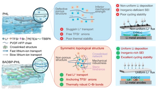 成都理工大学胡安俊研究员&龙剑平教授课题组联合北京化工大学陈仕谋教授、电子科技大学李飞副教授,在国际期刊Advanced Functional Materials (1区top,IF:19.0)上发表题为“Symmetrical Molecular Topology Enables Ultrathin Solid Polymer Electrolytes for Stable Lithium-Metal Batteries”的研究论文。该工作提出了一种对称的分子拓扑设计策略,以 2,2 - 双(4 - 烯丙氧基 - 3,5 - 二溴苯基)丙烷(BADBP)作为 PH/LiTFSI(定义为 PHL)电解质的功能添加剂单元,构建出三维交联的超薄(6 μm)固体聚合物电解质(定义为 BADBP-PHL)。通过分子尺度的结构工程,该设计同步解决了传统超薄固体聚合物电解质存在的多孔缺陷、离子电导率低及热稳定性差等问题(图 1)。首先,BADBP 的二烯丙氧基对称框架通过自由基聚合与 PHL 形成互穿网络,有效填充基体的多孔缺陷,构建起连续均匀的 Li⁺传输通道,使室温离子电导率提升至 0.35 mS cm⁻¹,较传统 PHL 电解质(<0.1 mS cm⁻¹)有显著提高。