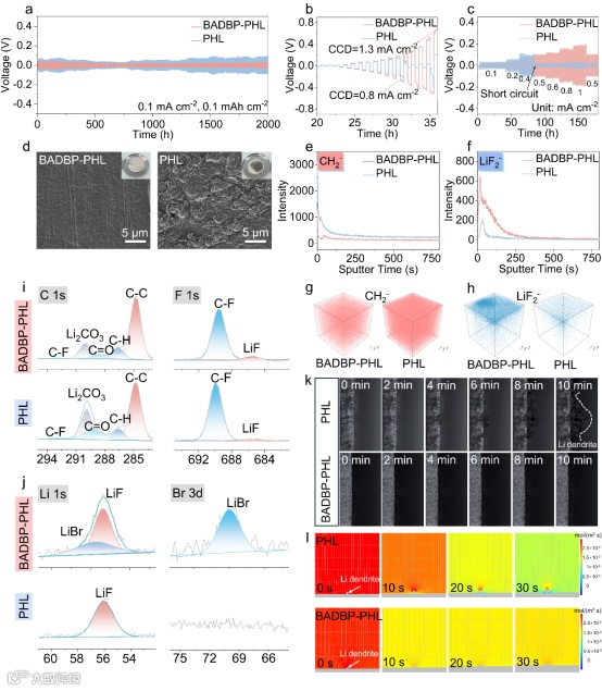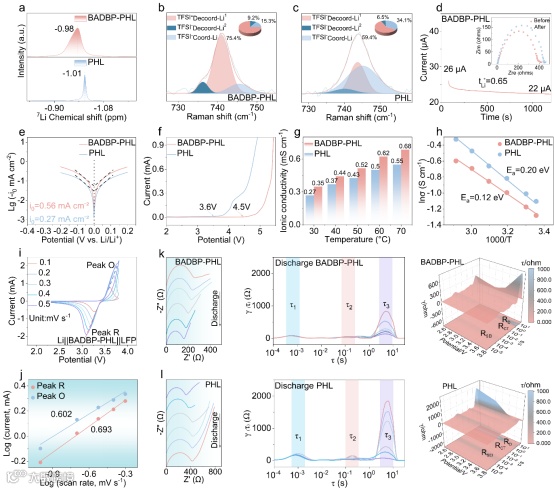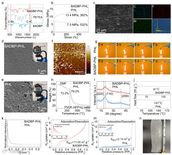 图 2 展示了 BADBP-PHL 电解质的物理特性。图 2a 为 BADBP-PHL 的傅里叶变换红外光谱(FTIR),可验证聚合物自由基交联反应的成功。图 2b 的应力 - 应变曲线表明该电解质具有较高的机械强度;此外,通过扫描电镜(SEM)对膜进行表征,以研究其表面结构及微观结构。图 2g、h 显示 BADBP-PHL 电解质膜具有良好的热稳定性。XRD 和 DSC 测试结果表明,BADBP-PHL 电解质的结晶度降低,这有利于锂离子的传输。为研究薄膜的孔隙结构,BET 测试证实 BADBP-PHL 电解质的孔隙较小,改善了与电极间的界面接触。