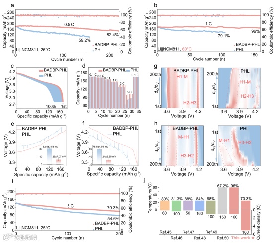 图 6 展示了 BADBP-PHL 电解质在全固态锂金属电池中的电化学性能。图 6a 和 6b 为 Li||BADBP-PHL||NCM811 电池在室温和 60°C 下的循环性能曲线,结果显示,BADBP-PHL 电池的容量始终高于 PHL 电池,且最终的容量保持率也均优于 PHL 电池。图 6d 呈现了不同电流密度下的倍率性能,可见 BADBP-PHL 电池在较高电流密度下表现出优异的循环能力。为验证 BADBP-PHL 电解质在阴极界面的稳定性,研究进行了恒流间歇滴定技术(GITT)和微分容量(dQ/dV)测试,结果证实其具有卓越的循环稳定性。此外,BADBP-PHL 电解质还能在 5C 倍率下稳定循环。图 6j 的电池性能比较结果进一步证明,该工作在全固态电池领域具有显著优势。