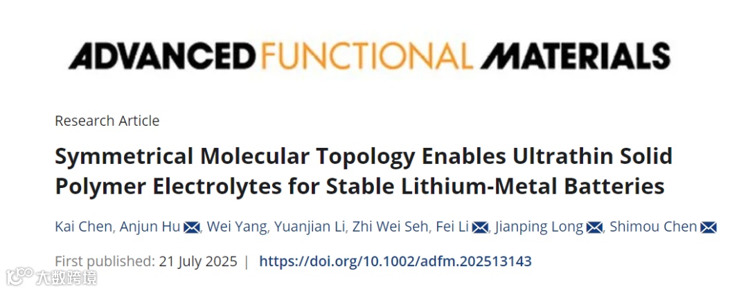 Kai Chen, Anjun Hu, Wei Yang, Yuanjian Li, Zhi Wei Seh, Fei Li, Jianping Long, Shimou Chen Symmetrical Molecular Topology Enables Ultrathin Solid Polymer Electrolytes for Stable Lithium-Metal Batteries, Adv. Funct. Mater. (2025).