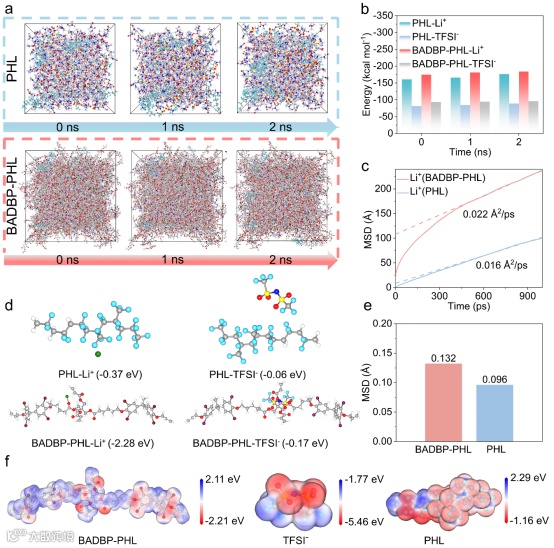 分子动力学(MD)模拟(图 3a)展示了 PHL 和 BADBP-PHL 的平衡快照,结果表明 BADBP-PHL 中的交联网络结构使其形成更紧凑的形态。密度泛函理论(DFT)计算(图 3b)显示,Li⁺与 BADBP-PHL 的结合能高于与 PHL 的结合能,说明 BADBP-PHL 中 Li⁺的转移能力更强;同时,BADBP-PHL 与 TFSI⁻阴离子的结合能较强,证实其对阴离子具有更强的固定化能力。此外,吸附能分析和静电作用计算表明,这种设计结构不仅保留了 Li⁺在 PHL 中的传输能力,还构建了额外的快速传输通道。综合理论计算结果可知,对称拓扑结构通过选择性固定 TFSI⁻优化了 Li⁺的传输路径,进而提高了离子迁移效率。