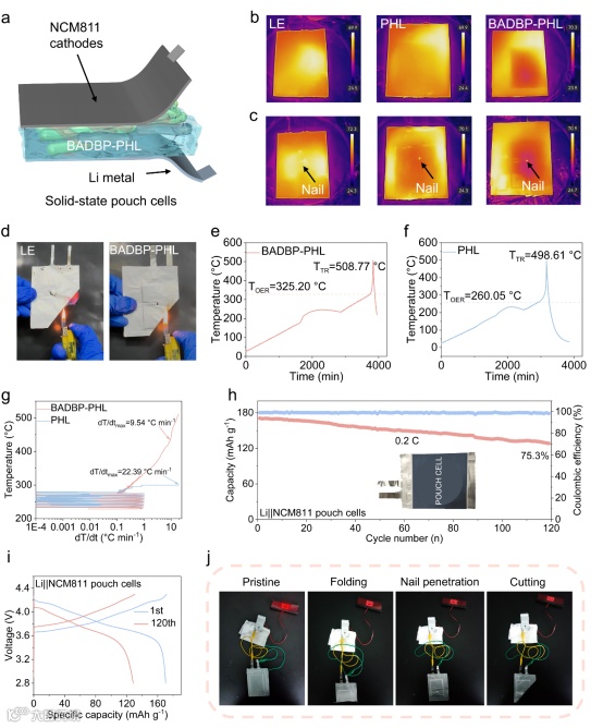 图 7 通过多项安全性测试,展示了 BADBP-PHL 电解质在实际电池中的优异表现。图 7a 呈现了全固态软包电池的组装过程。红外热成像结果表明,BADBP-PHL 电解质在软包电池尺度下具有良好的热稳定性;明火点燃电芯测试也证实其具备不易燃的特点。图 7e、f 和 g 的加速量热测试(ARC)结果显示,BADBP-PHL 在高温下具有显著的热稳定性,且热失控发生温度远高于传统液体电解质(LE)。图 7h、i 展示了 BADBP-PHL 软包电池的长循环性能,循环 120 圈后,容量保持率为 75.3%。此外,图 7j 的测试结果证明,该软包电池具有良好的机械滥用耐受性。