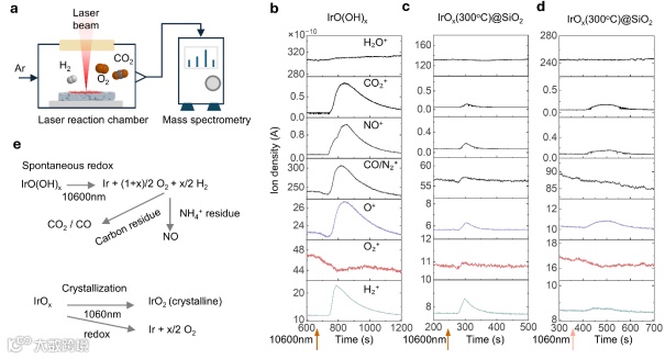 研究利用原位质谱技术实时监测激光照射下的气体释放行为,揭示了不同激光条件下铱前驱体的反应机制。CO₂激光(10600 nm)处理IrO(OH)ₓ时释放大量H₂和含氧气体,表明材料发生自发还原反应,最终转化为金属Ir;而经过300 °C预热的前驱体气体释放显著减少,显示出更高的热稳定性。相比之下,光纤激光(1060 nm)加热过程温和,仅产生少量气体,有利于非晶IrOx向晶态IrO₂的结构转变。结合XRD结果,研究确认CO₂激光诱导还原,而光纤激光则驱动结晶转化,两者代表不同的激光调控反应机制。