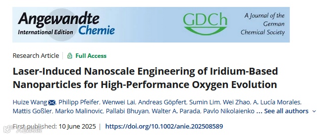 2025年6月10号,慕尼黑工大,亥姆霍兹可再生能源研究所 王惠泽&Marc Ledendecker 团队 在Angewante Chemie 上在线发表了题为“Laser-Induced Nanoscale Engineering of Iridium-Based Nanoparticles for High-Performance Oxygen Evolution” 的研究。该研究开发出一种创新的“激光诱导纳米炉技术”,首次在常温条件下实现了超小结晶金红石相氧化铱纳米颗粒的固态合成,该方法利用二氧化硅基质构建纳米级反应腔,通过激光局域加热触发固态反应,避免了传统高温处理所导致的颗粒团聚与比表面积降低问题。所合成的约2纳米晶态氧化铱颗粒展现出优异的质量活性和远超商业材料的稳定性,在酸性析氧反应(OER)中达到了RuO₂基催化剂的活性水平。