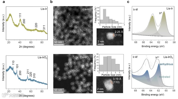 通过 XRD、HAADF-STEM 和 XPS 表征,系统揭示了激光合成的 Lis-Ir 和 Lis-IrO₂ 的晶体结构、纳米形貌和化学状态,证实分别为超小粒径的金属铱和晶态金红石型氧化铱。