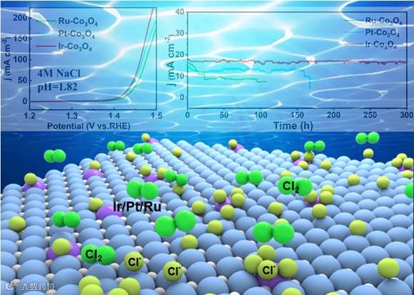 在 4.0 M NaCl(pH = 1.82)溶液中进行的CER测试表明,Ir-Co₃O₄ 在性能上显著优于 Pt-Co₃O₄ 和 Ru-Co₃O₄。电化学数据证实: Ir-Co3O4在10 mA cm-2过电势(27 mV)及质量活性(38,125 A gIr-1)均显著优于Pt-Co3O4(29 mV, 30,706 A gPt-1)和Ru-Co3O4(39 mV, 24,353 A gRu-1),其TOF值(35.74 s-1)为Pt、Ru体系的1.12倍和1.96倍,Cl₂选择性(≥96%)与300 h稳定性进一步印证Ir位点的综合性能优势。