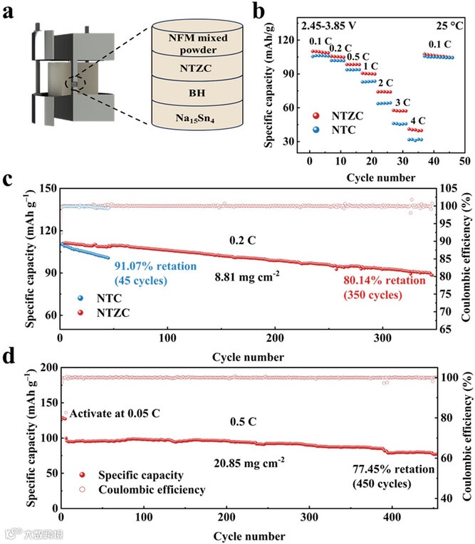 a) Schematic illustration of NTZC-based ASSSBs. b) Rate performance of the NTC-based and NTZC-based batteries at different current densities. c) Long-term cycling performance of NTC-based and NTZC-based ASSSBs at 0.2 C. d) Cycling performance of the NTZC-based ASSSBs under high cathode loading conditions.