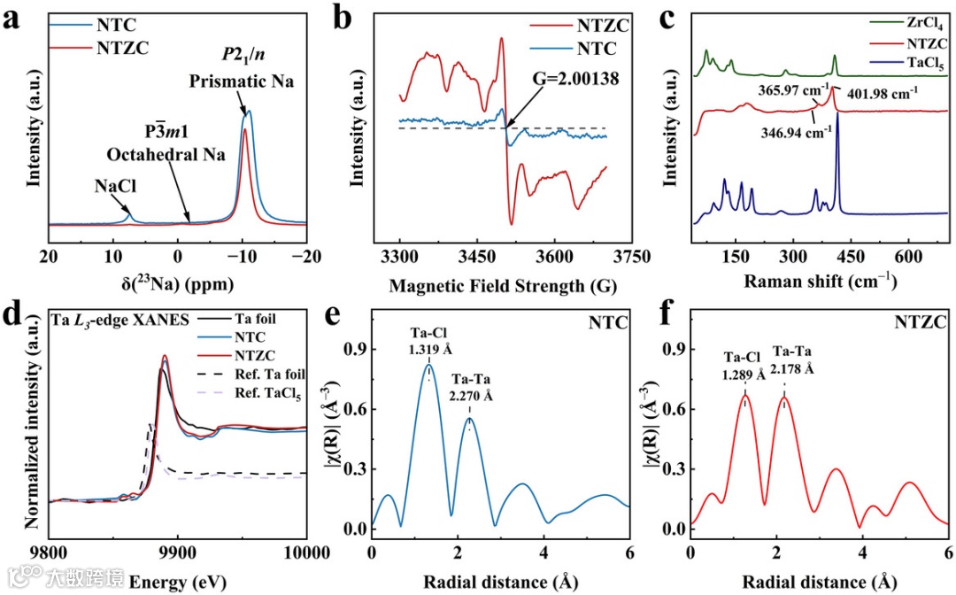 a) 23Na SSNMR spectra of NTC and NTZC SSEs. b) EPR spectra of NTC and NTZC SSEs. c) Raman spectra of amorphous NTZC SSEs and crystalline ZrCl4, and TaCl5 references. d) Ta L3-edge XANES spectra of the Ta foil, NTC, NTZC electrolytes, and the reference samples. Fourier-transformed EXAFS spectra (R-space) of e) NTC and f) NTZC.