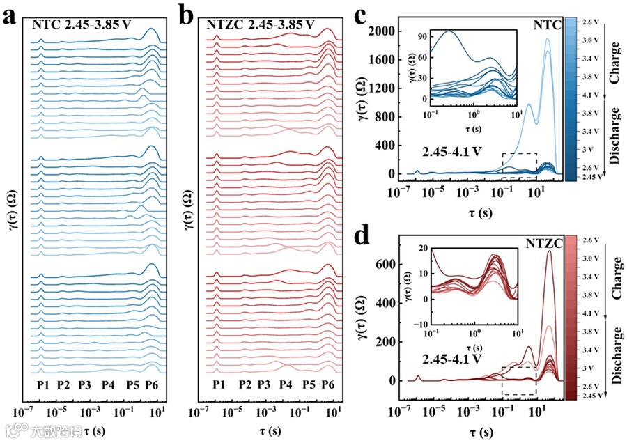 DRT spectra extracted from EIS for a) NTC-based and b) NTZC-based ASSSBs cycled within 2.45–3.85 V, and for c) NTC-based and d) NTZC-based ASSSBs cycled within 2.45–4.1 V.