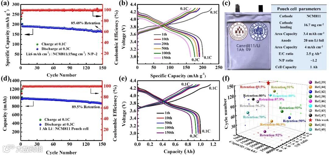 Figure 6. Electrochemical performance of Li||NCM811 full cells in our electrolyte under low N/P. a) Cycling performance of Li||NCM811 full cell under N/P ratio of 2. b) Charge/discharge profiles from selected cycles under N/P ratio of 2. c) Image of the Li||NCM811 pouch cell with low N/P and parameters of the pouch cell. d) Cycling performance of Li||NCM811 pouch cell performed at 0.1 C charge/0.3 C discharge within 3.0–4.3 V. e) Charge/discharge profiles of Li||NCM811 pouch cell from selected cycles. f) The comparison of cycle number, capacity and N/P ratio with previously reported (References are from Supporting Information).