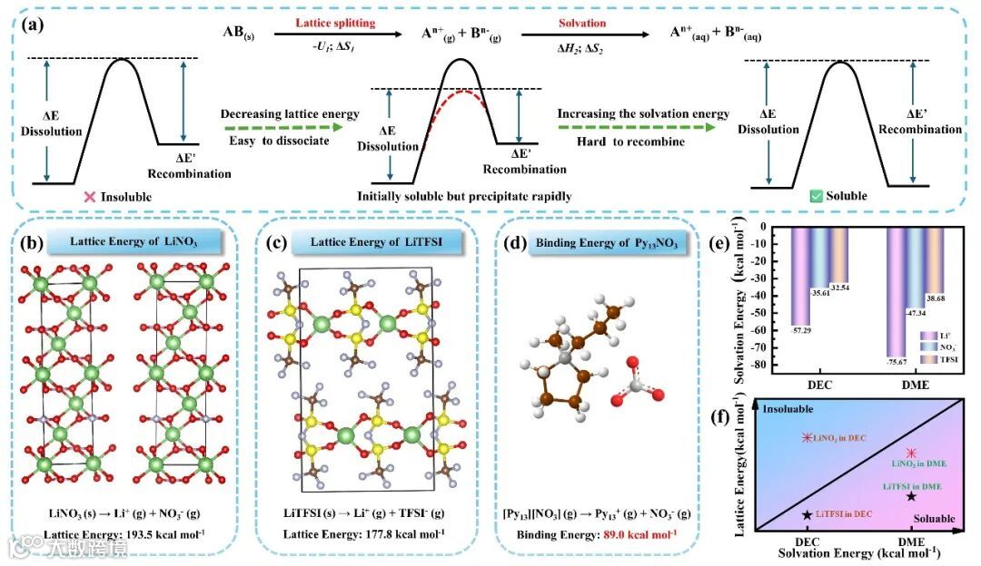 Figure 1. a) Strategies for improving the solubility of salts during the dissolution process. They include decreasing lattice energy of salts (U) and incerasing solvation energy of organic solvents (ΔH). b) Optimized structure for LiNO3 lattice and DFT-predicted lattice energy calculation of LiNO3. c) Optimized structure for LiTFSI lattice and DFT-predicted lattice energy calculation of LiTFSI. d) The structure for Py13NO3 and DFT-predicted binding energy of Py13+ and NO3−. e) DFT-predicted solvation energy calculations of Li+, NO3−, TFSI− in DEC and DME solvent. f) The dissolution equilibrium for different salts (LiNO3, LiTFSI) in DEC or DME solvent.